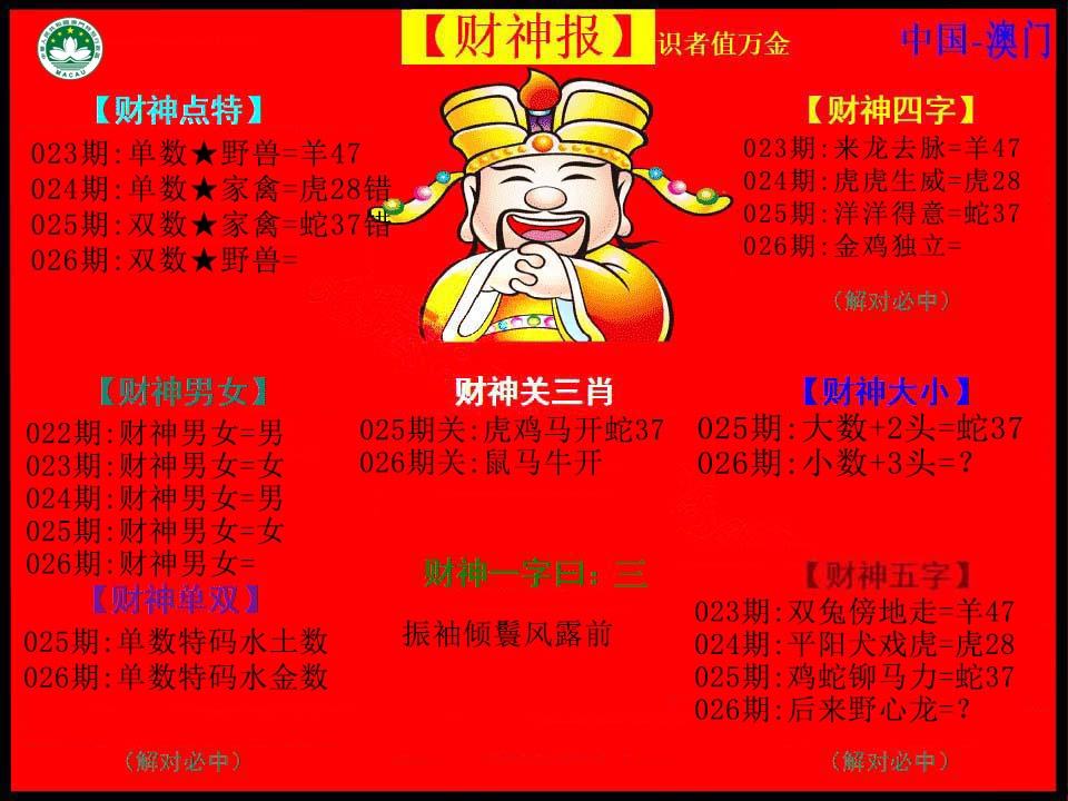 023期:【鸡虎猴龙蛇羊】开:羊47中 |